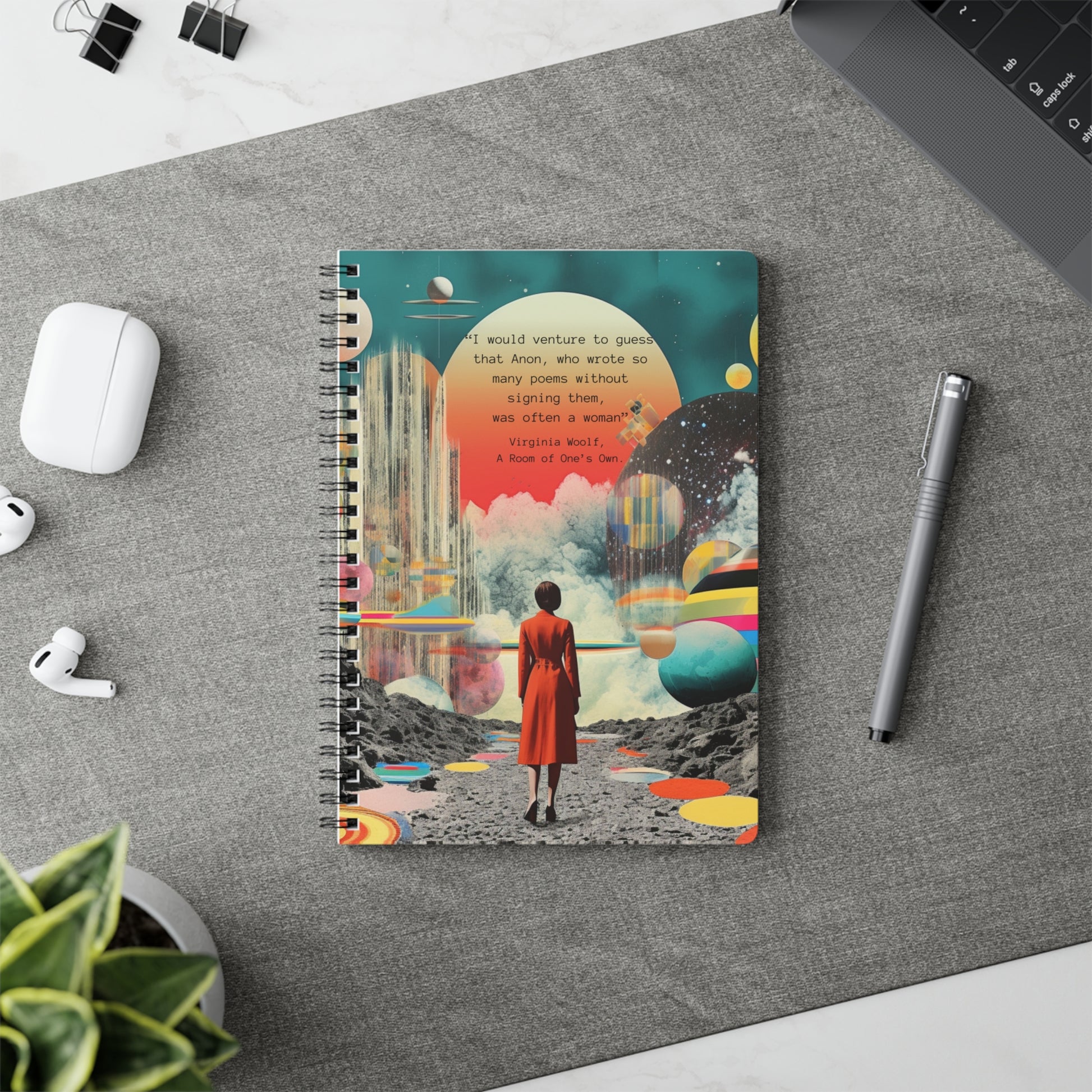 For lovers of the iconic quote from Virginia Woolf's 1929 novel, A Room of One's Own, this wire-bound softcover notebook is a delight. Made with gloss-laminated 280gsm paper covers for a luxurious feel, the notebook features 90gsm lined papers with 150 pages total for all note-taking purposes. Each notebook comes with black wire binding in A5 size, with this design printed on the front cover.
